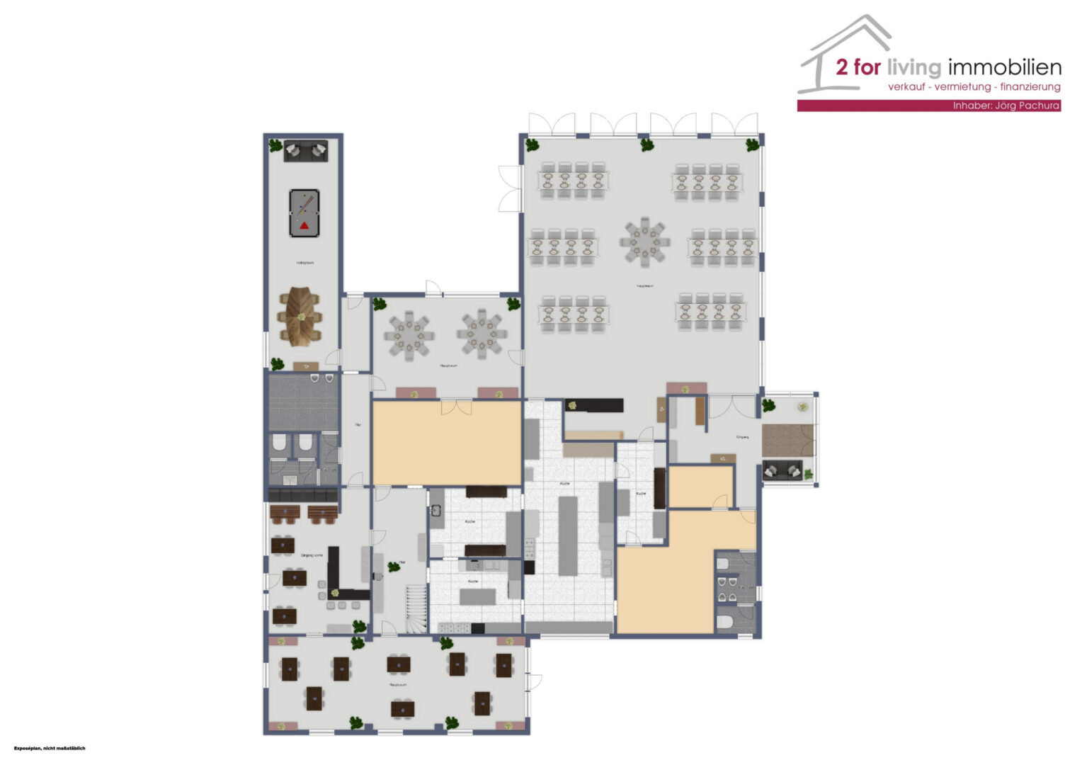 Zunächst umfasst der Altbau einen traditionsreichen Landgasthof mit einem angeschlossenen Restaurant und drei Speiseräumen für insgesamt 85 Personen. Ergänzt wird dieser Bereich durch eine Kegelbahn sowie die Gästetoiletten im hinteren Teil des Gebäudes. Die Umkleide- und Toilettenräume des Personals befinden sich hingegen im Dachgeschoss etwas abseits des gastronomischen Betriebs. Die Restaurantküche, die im Rahmen der Erweiterung und des Umbaus zentral in die Mitte des Gebäudekomplexes verlegt wurde, ist bequem beidseitig sowohl vom Gasthof als auch vom Festsaal erreichbar. Alle Räume für die Lagerung und Zubereitung der Speisen wurden praktischerweise als „Rundgang“ angelegt, um dem Küchenpersonal effiziente Arbeitsabläufe zu ermöglichen.