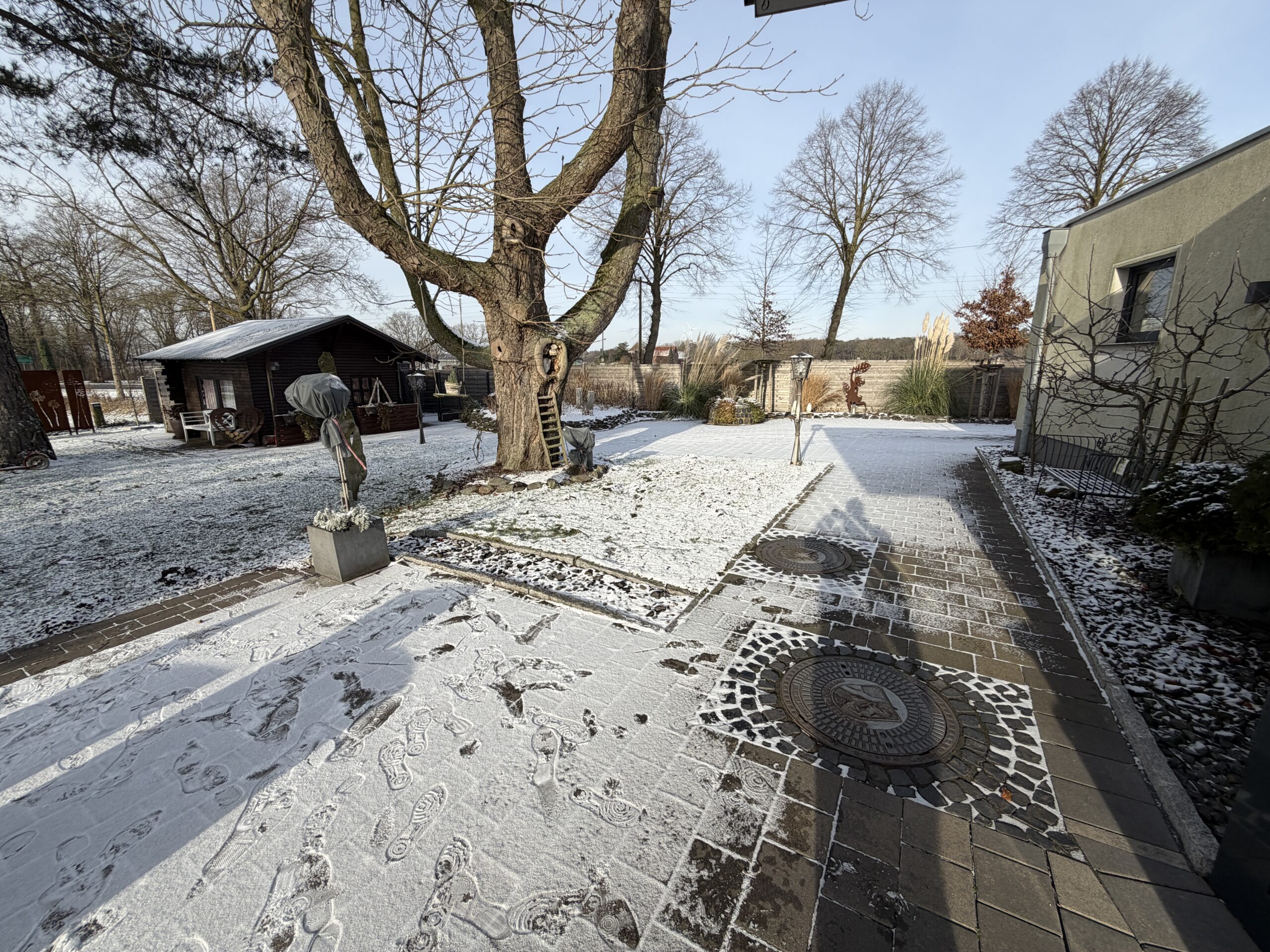 Die zentral gelegene Diele fungiert als praktischer Verteiler aller Räume und schafft bereits beim Betreten ein strukturiertes Raumgefühl. Das großzügige Wohnzimmer mit seinem freistehenden Essbereich bildet das Herzstück des Wohnens und lädt zum Entspannen sowie zum geselligen Beisammensein ein. Direkt angrenzend befindet sich die Küche mit einem gemütlichen Sitzplatz, die funktionales Arbeiten und kommunikatives Wohnen harmonisch miteinander verbindet. Beide Räume begeistern mit einem traumhaften Ausblick ins Grüne, der zu jeder Tageszeit für Wohlbefinden sorgt.