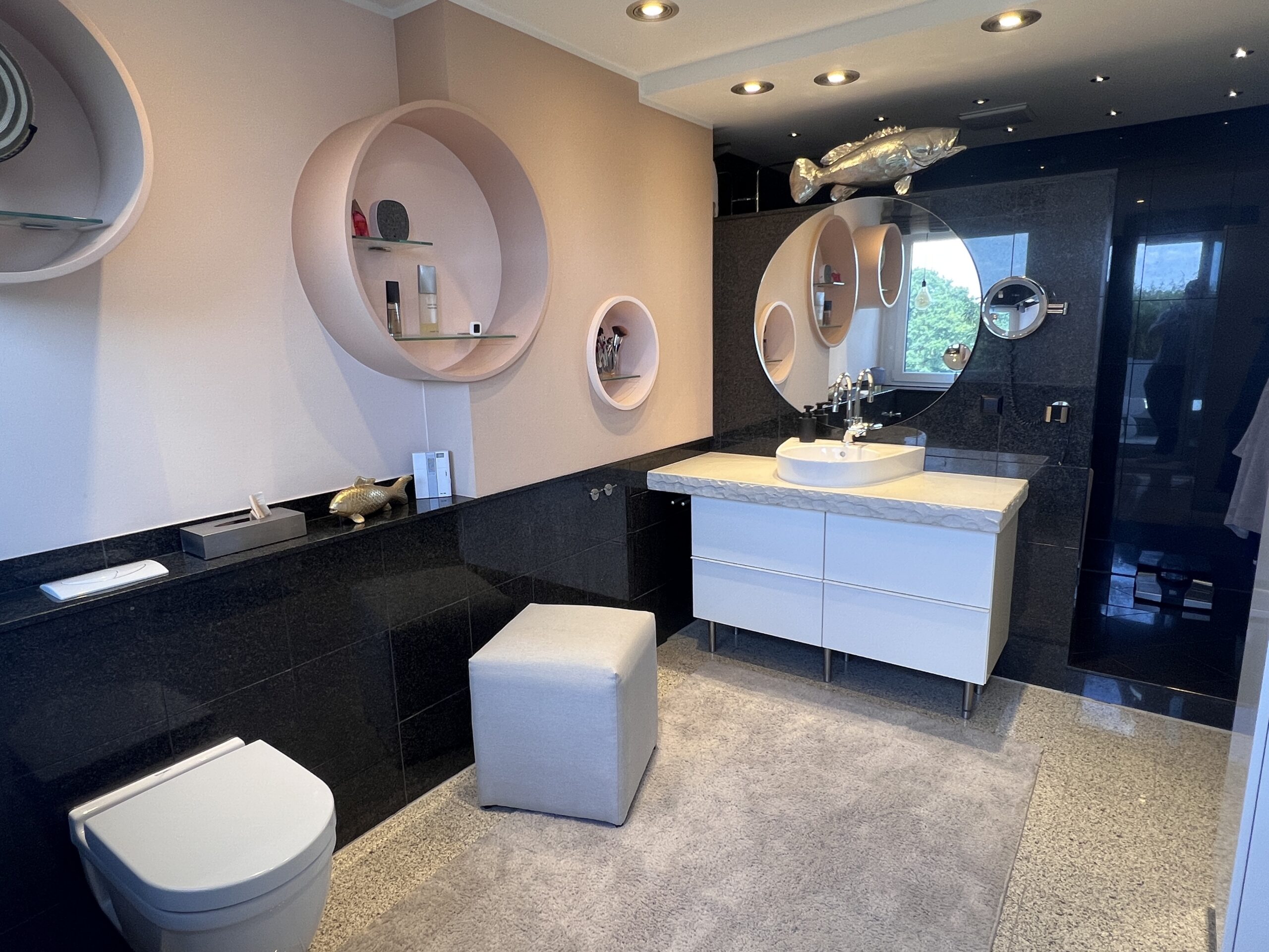 Das exklusive Bad en Suite erfüllt höchste Ansprüche mit einem edlen Aufbauwaschtisch aus Porzellan, einer Toilette sowie einer großzügigen, ebenerdigen Regendusche.