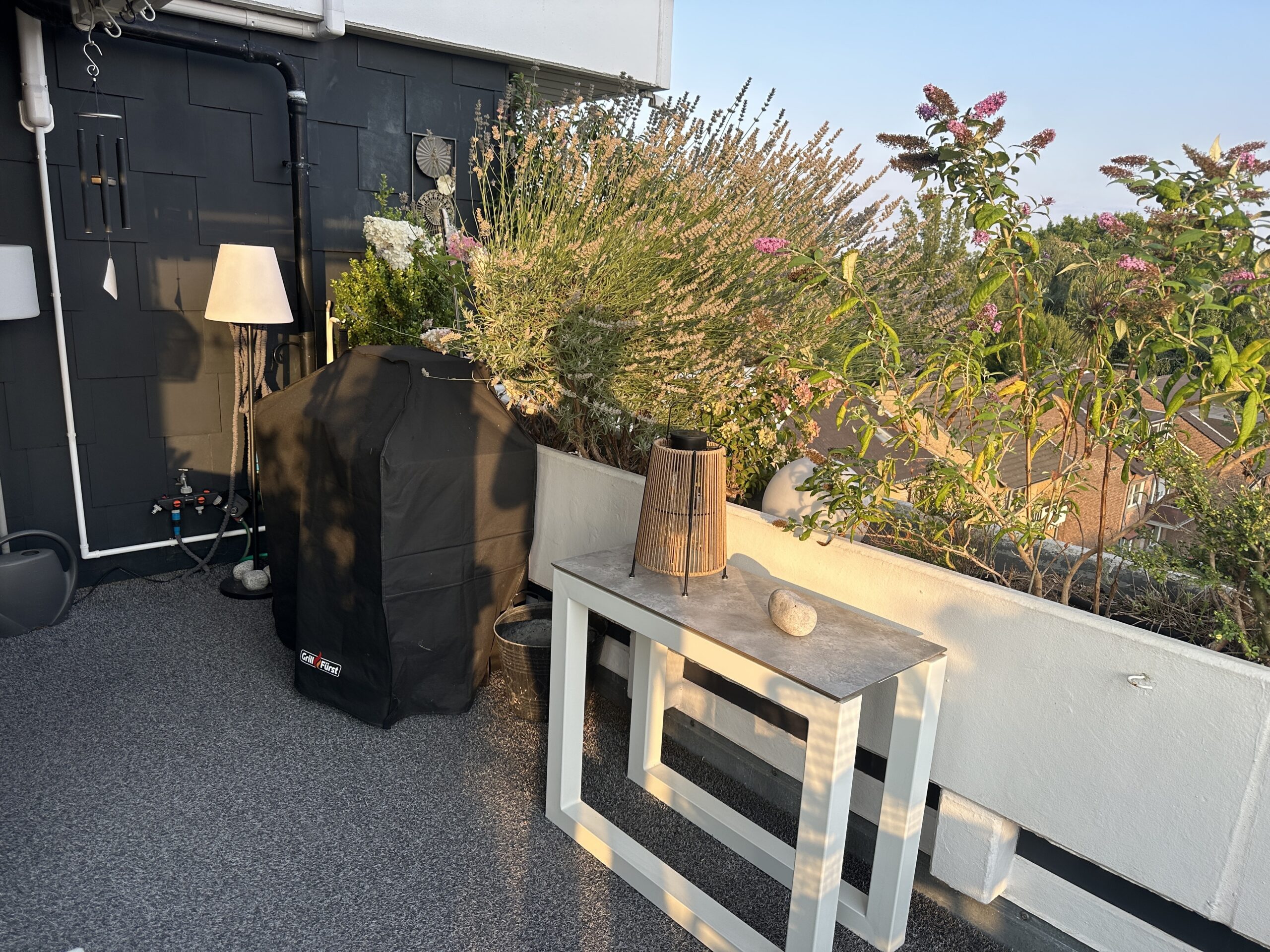 Ein weiteres Highlight ist die überdachte Süd-West-Terrasse, die durch ihren windgeschützten Lounge-Bereich sowie einer zusätzlichen Sitzmöglichkeit unter freiem Himmel besticht. Hier vereinen sich Entspannung und Gemütlichkeit zu einem Rückzugsort, der jeglichen Wünschen gerecht wird. Ein von außen begehbarer Abstellraum sorgt für bequemes Lagern von Gartenmöbeln und Accessoires.
