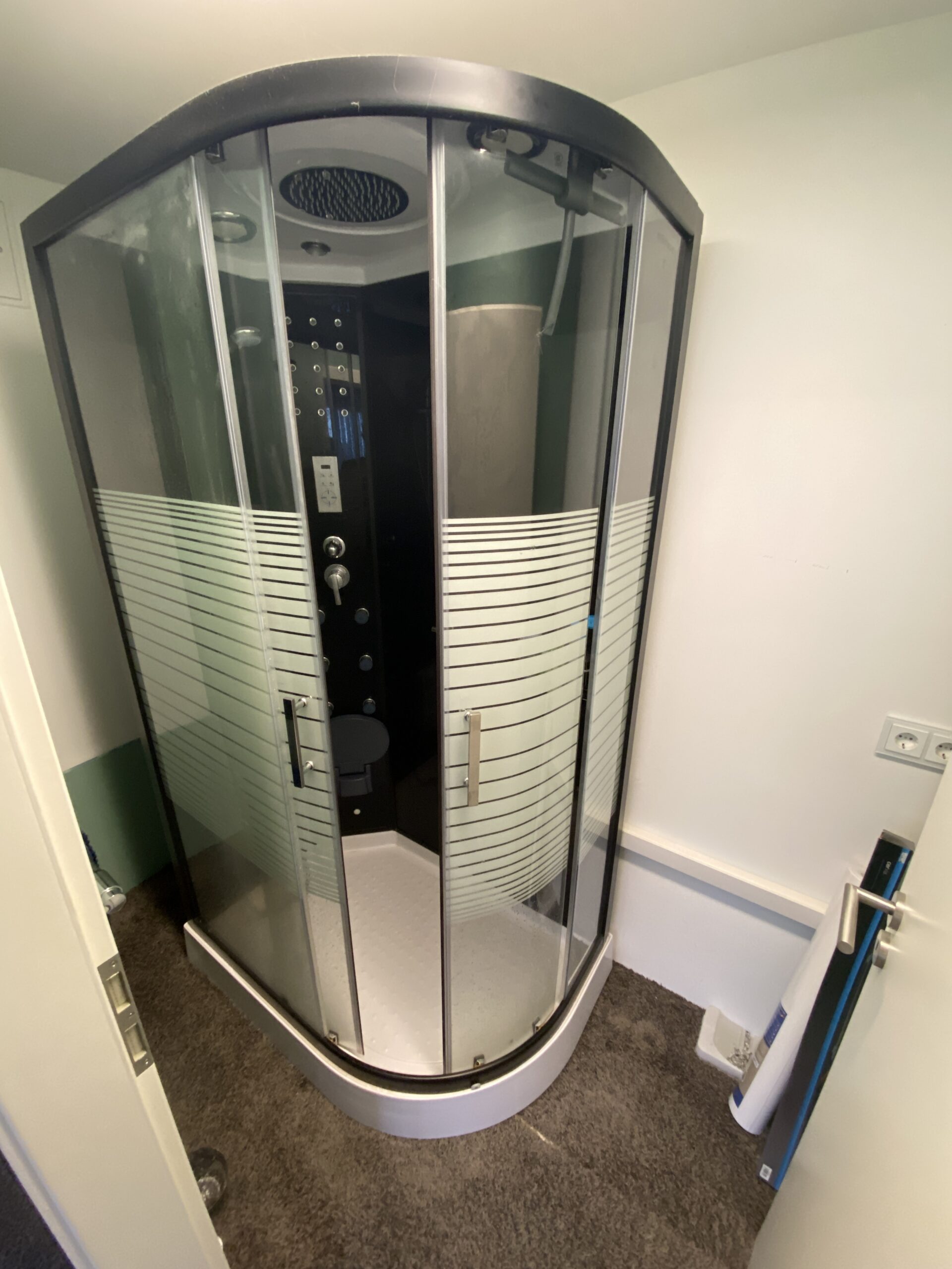 Weiterhin bietet das darüberliegende Parkdeck Platz für etwa zehn Fahrzeuge und rundet somit das Stellplatzangebot optimal ab. Im hinteren Bereich des Decks wurde im Nachhinein ein gemauerter Baukörper errichtet, der als Büro- und Aufenthaltsbereich für den derzeitigen Eigentümer dient. Der Baukörper ist wohnlich ausgestattet und umfasst zwei Räume sowie ein separates WC und eine Dusche – ideal zur temporären Nutzung bei kurzfristigen Aufenthalten vor Ort.