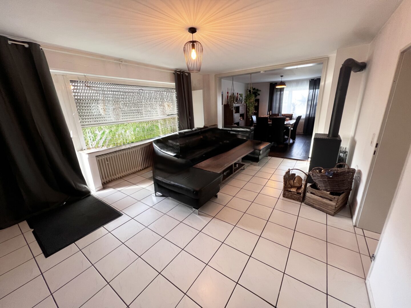 Die Erdgeschosswohnung bietet mit einer Wohnfläche von 86,30 m² eine flexible 2,5- bis 3,5-Raumstruktur. Von der Diele ist unmittelbar das weitläufige und lichtdurchflutete Wohnzimmer begehbar, dessen moderner Kaminofen eine behagliche Atmosphäre schafft. Von hier aus erfolgt der Zugang auf eine wind- und sichtgeschützte Terrasse, die einen herrlichen Rückzugsort im Freien offenbart und mit ihrem unverbaubaren Weitblick über Wiesen und Felder beeindruckt. Ein breiter Wanddurchbruch verbindet das Wohnzimmer fließend mit dem angrenzenden Esszimmer, das mit einem dunklen Holzfußboden ausgestattet ist und Platz für einen großen, freistehenden Esstisch bietet – eine ideale Lösung für Familienfeiern oder gesellige Abende mit Freunden. Erwähnenswert ist, dass sich die beiden Räume bei Bedarf ohne großen baulichen Aufwand wieder trennen lassen. Die gegenüber angelegte Küche mit einem kleinen Essplatz und kleiner Abstellkammer überzeugt durch kurze Wege und praktische Stauraumnutzung. Ergänzt wird diese Wohneinheit durch einen funktionalen Schlafraum im hinteren Teil der Wohnung sowie ein helles Tageslichtbad mit weißen Sanitärobjekten, Badewanne und Dusche.