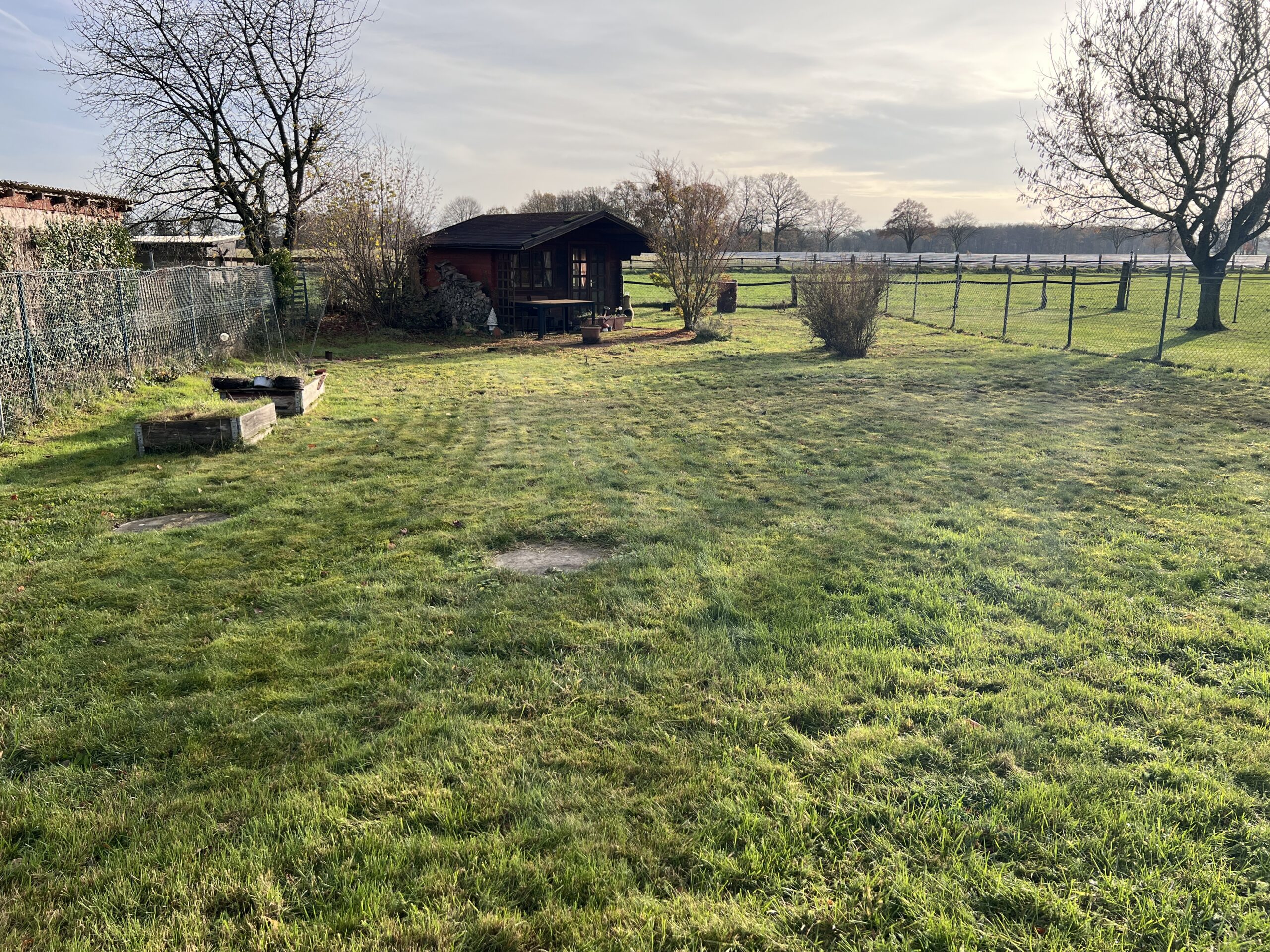 Dieser Außenbereich hinter dem Haus wurde in zwei Gartenabschnitte unterteilt, sodass jede Mietpartei ihren eigenen privaten Bereich nutzen kann – einer mit einem Gartenhaus (Eigentum des Mieters), der andere mit einem praktischen Geräteschuppen.
