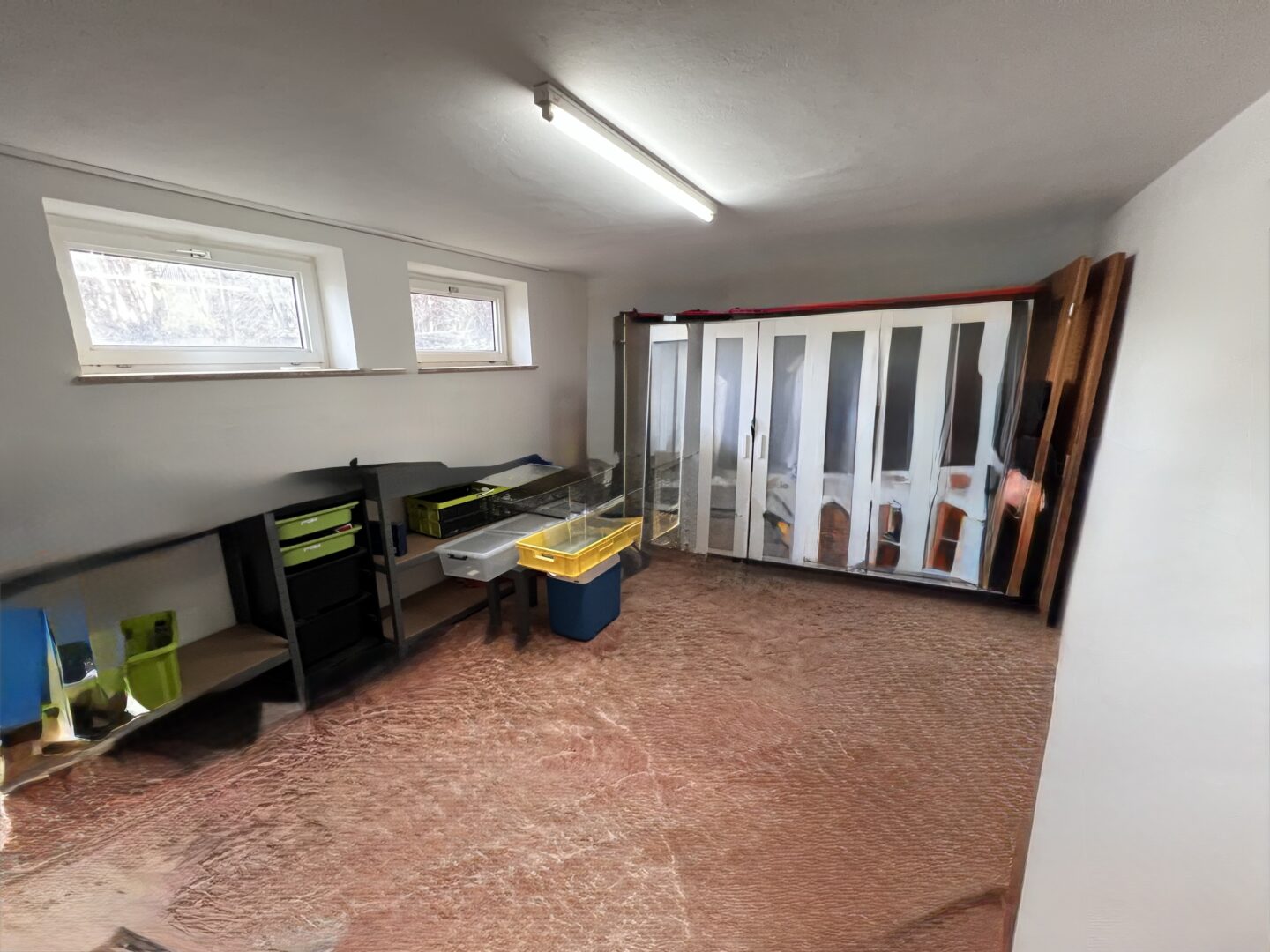 Im Kellergeschoss des Hauses befinden sich ein gemeinschaftlicher Wasch- bzw. Trockenraum sowie ein Heizungskeller mit einem separaten Raum zur Unterbringung der Öltanks. Zudem stehen beiden Parteien private Kellerräume zur Verfügung, wobei einer der Räume wohnlich mit zwei Isolierglasfenstern sowie einer Heizung versehen ist. Des Weiteren führt eine Außentreppe vom Keller unmittelbar auf das rückwärtige Grundstück.
